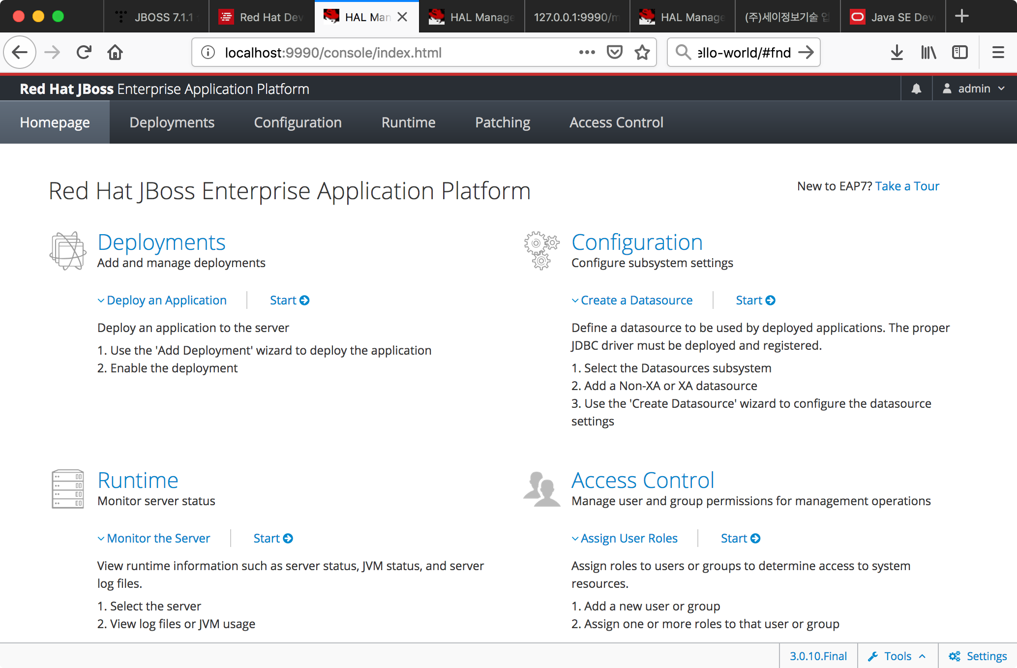 http://localhost:9990 에서는 관리자 페이지를 확인할 수 있다. 접속하기 위해서는 툴설치시 설정했던 관리자(admin)에 대한 계정이 필요하다.