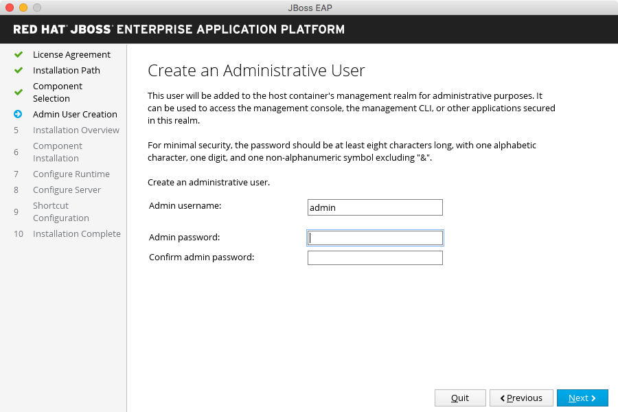 jBoss 관리자페에지에 접속할 admin 계정에 대한 비밀번호를 묻는다. 비밀번호는 꼭 기억하자.