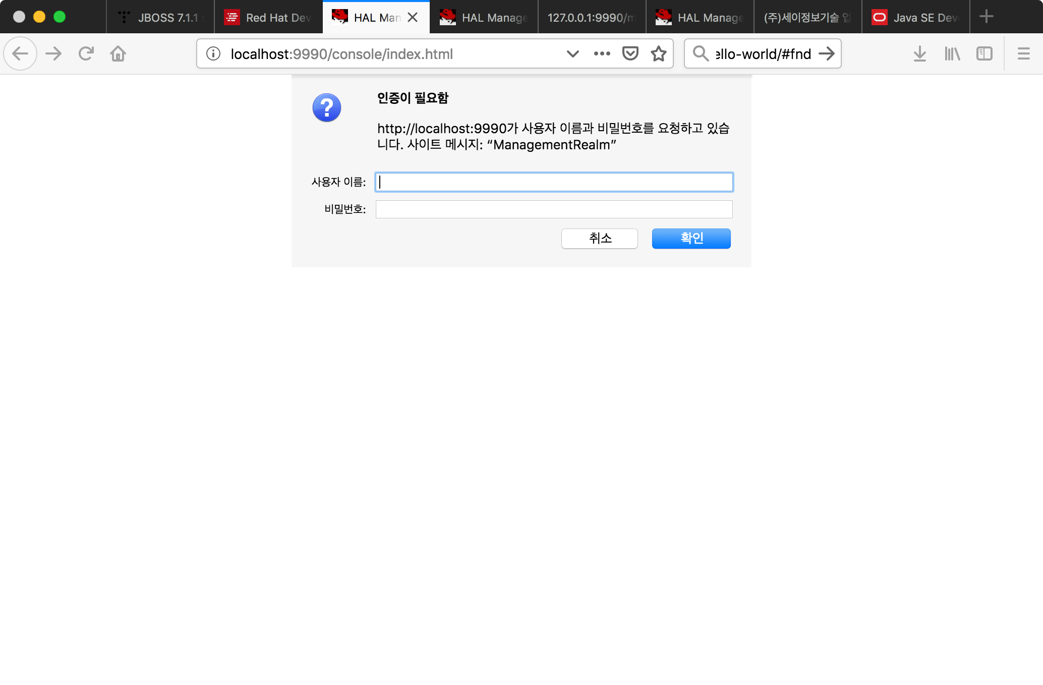 http://localhost:9990 에서는 관리자 페이지를 확인할 수 있다. 접속하기 위해서는 툴설치시 설정했던 관리자(admin)에 대한 계정이 필요하다.