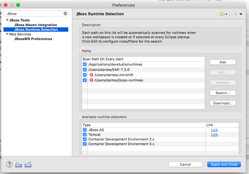다시 환결설정 메뉴에서 'JBoss Tools/JBoss Runtime Detection'을 클릭 후 'Paths' 에서 다운로드 버튼을 누른다.