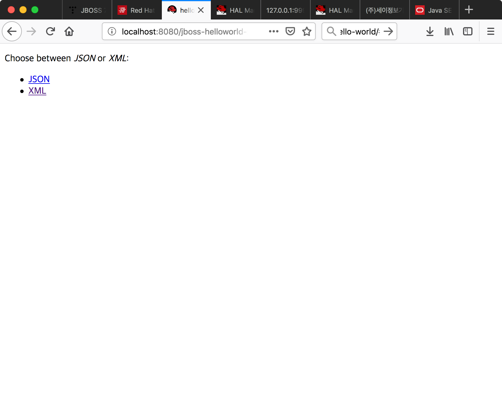 브라우저에서 샘플페이지를 확인할 수 있다. (http://localhost:8080/jboss-helloworld-rs)