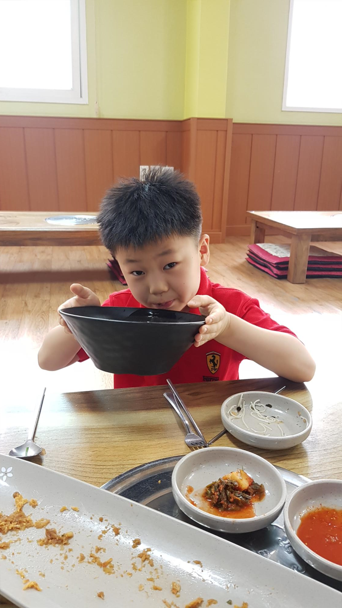 국수와 돈가스를 시켰는데, 아이가 맛있게 먹는다.