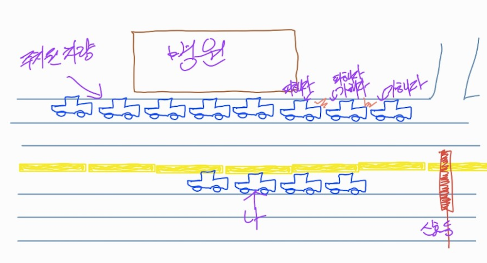 근처 병원 때문인지 한쪽 차선을 주차장처럼 쓰고 있지만 차선이 많아 교통에는 영향을 주지 않는다.