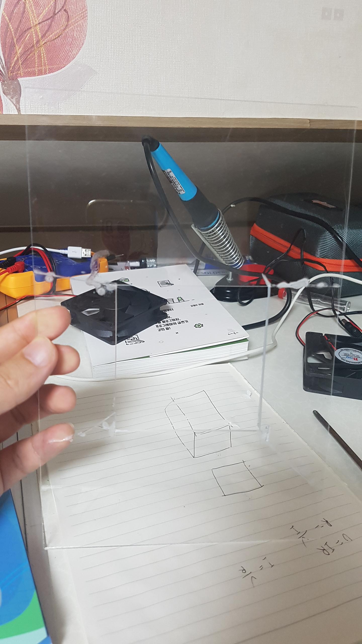 팬을 넣고 실리콘으로 마감을 했다. 실리콘 마감은 영 실력이 안는다. 의도는 아크릴판 가운데에 구멍을 내어 팬을 넣을 예정이었는데, 자르니 쫙 갈라졌다. 지금 생각해보면 처음부터 안되었던 것 같다. 처음부터 반을 갈라 구멍을 내고 팬들 달고 홈을 맞춘 후 본드를 붙였다면 좀 깔끔하지 않았을까 한다. 아크릴이 갈라지는 판에 좀 더 지저분하게 되었다. 휴지통에 구멍을 내어 전원선들을 빼낸 후 전압발생기에 연결하면 완성.