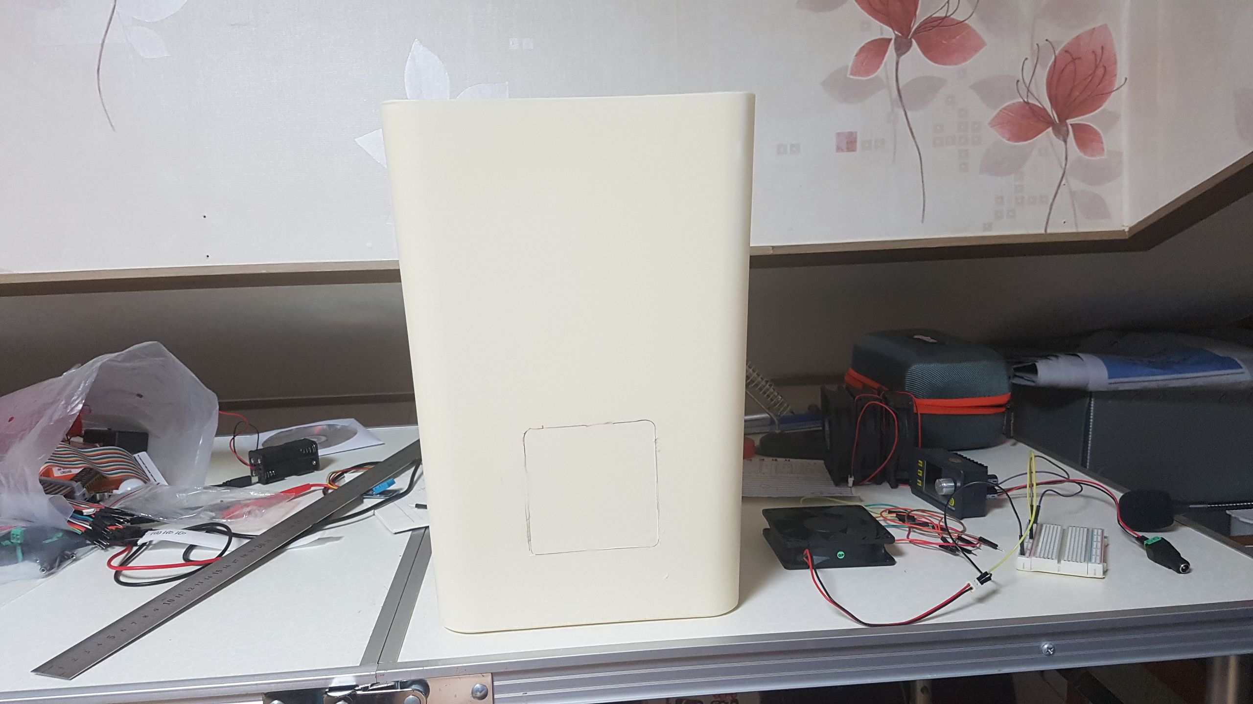 아크릴이 갈라지는 판에 좀 더 지저분하게 되었다. 휴지통에 구멍을 내어 전원선들을 빼낸 후 전압발생기에 연결하면 완성.