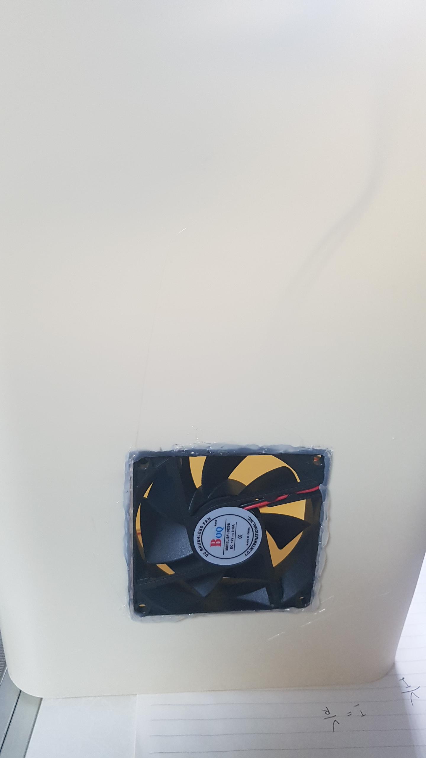 의도는 아크릴판 가운데에 구멍을 내어 팬을 넣을 예정이었는데, 자르니 쫙 갈라졌다. 지금 생각해보면 처음부터 안되었던 것 같다. 처음부터 반을 갈라 구멍을 내고 팬들 달고 홈을 맞춘 후 본드를 붙였다면 좀 깔끔하지 않았을까 한다.