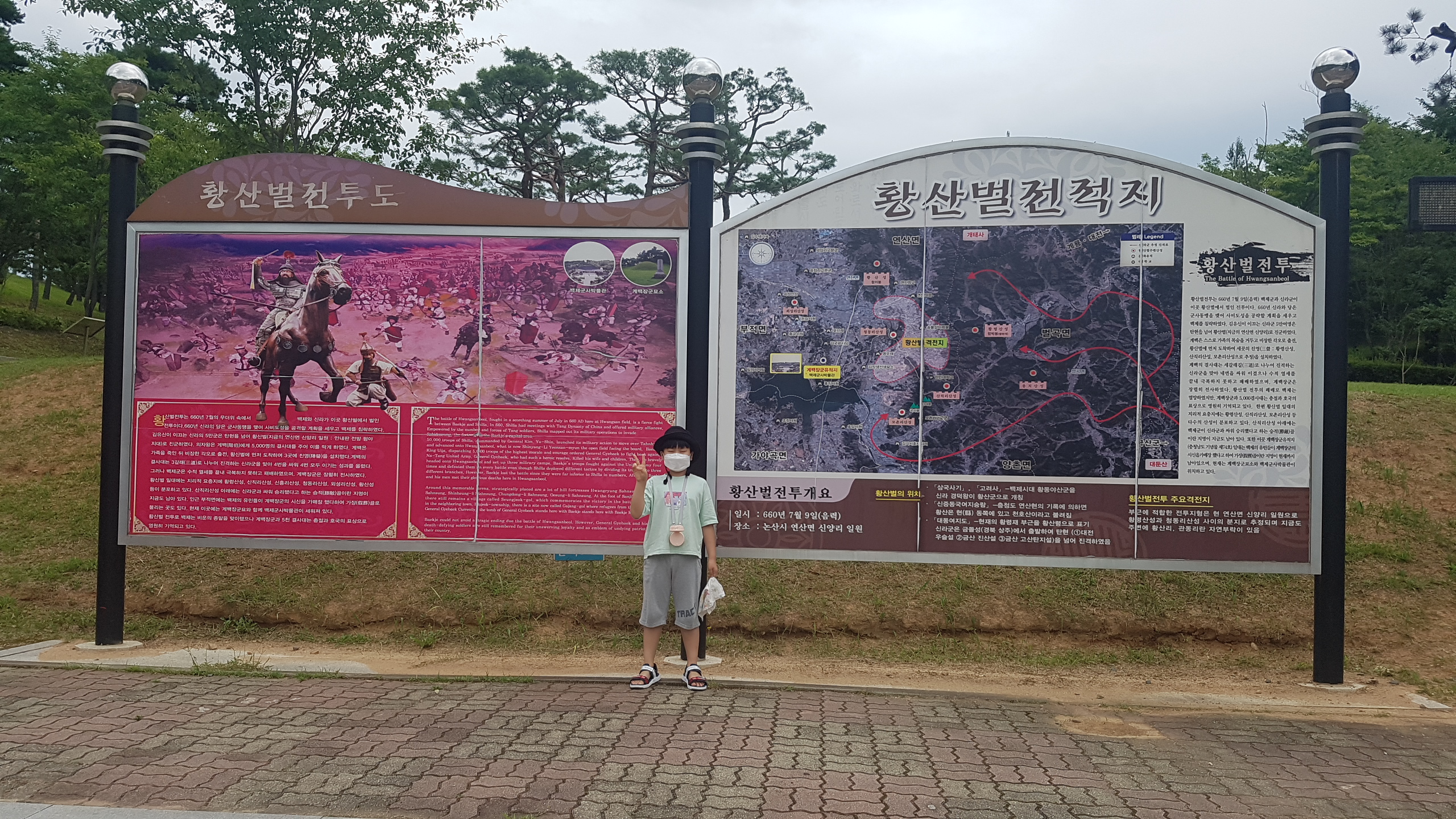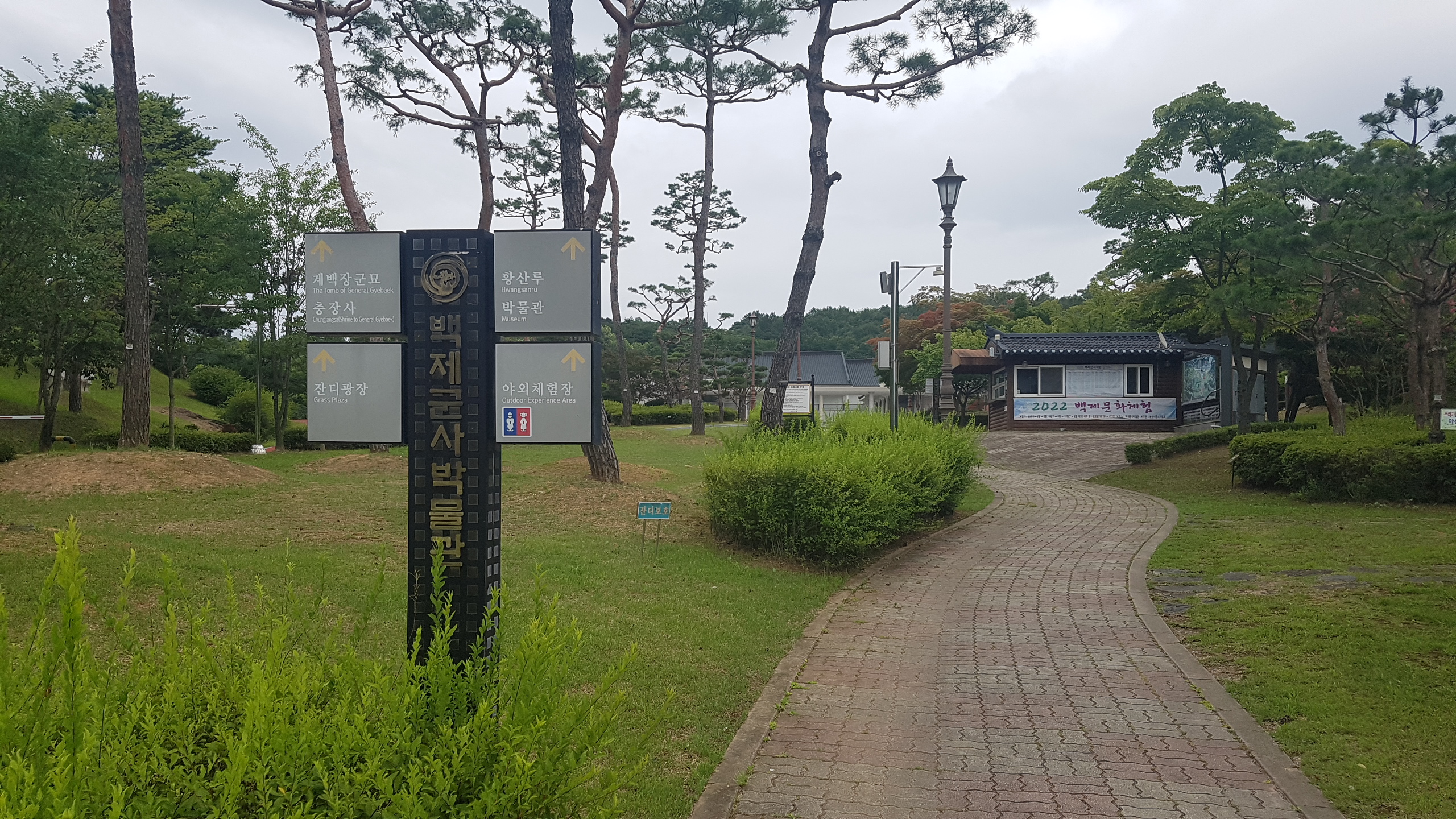 계백장군묘에서 동상까지는 방향이 서로 반대이며 동상은 높은 언덕에 설치되어 있다.
