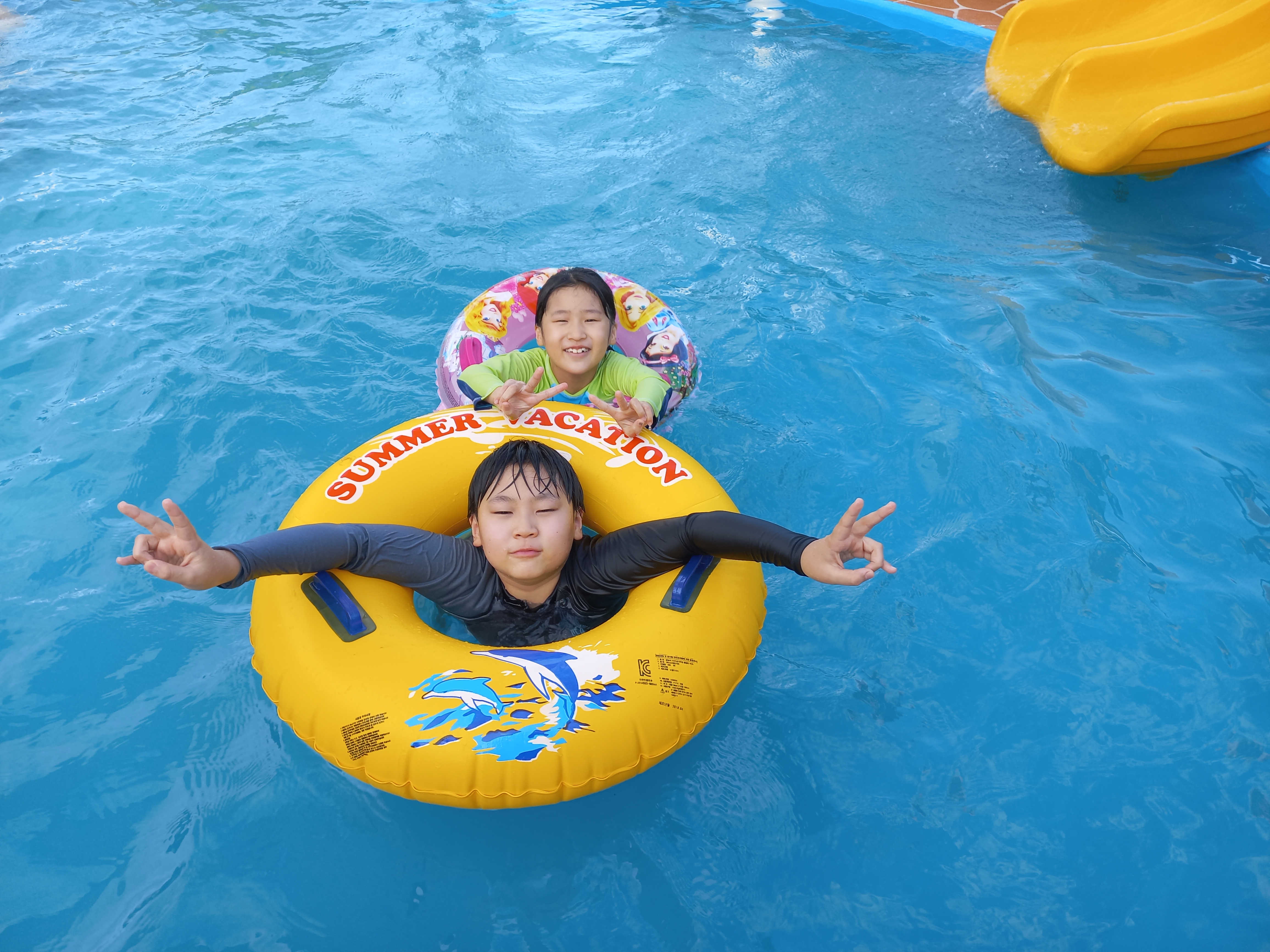 오자마자 짐도 못풀고 튜브에 바람 먼저 넣고 있다. 아빠가 더 신났군 수영장은 물이 약간 얕은 유아용과 일반용이 있다.