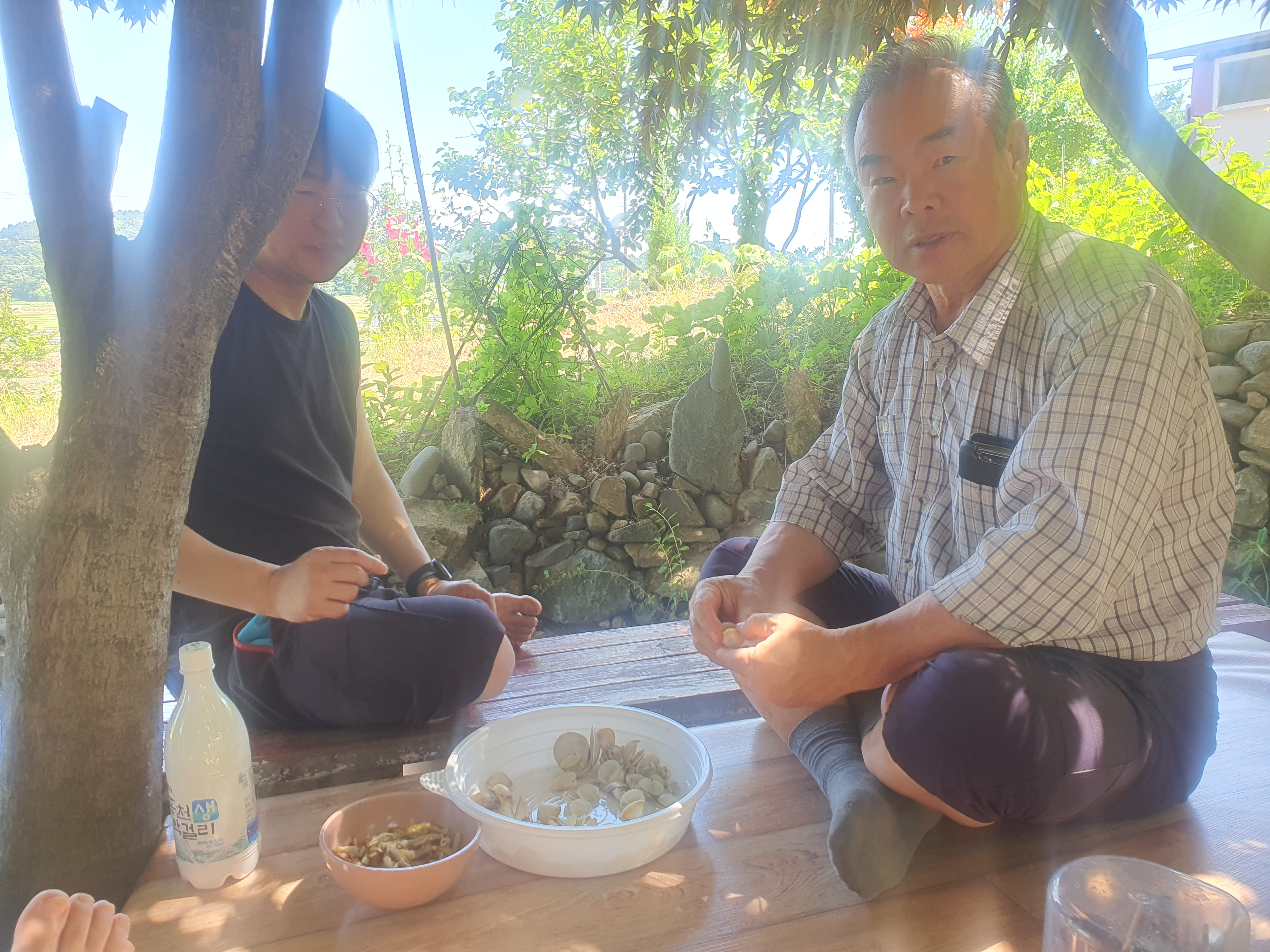 도착 후 갯벌 가기 전에 간단한 과자와 막걸리를 먹는다.