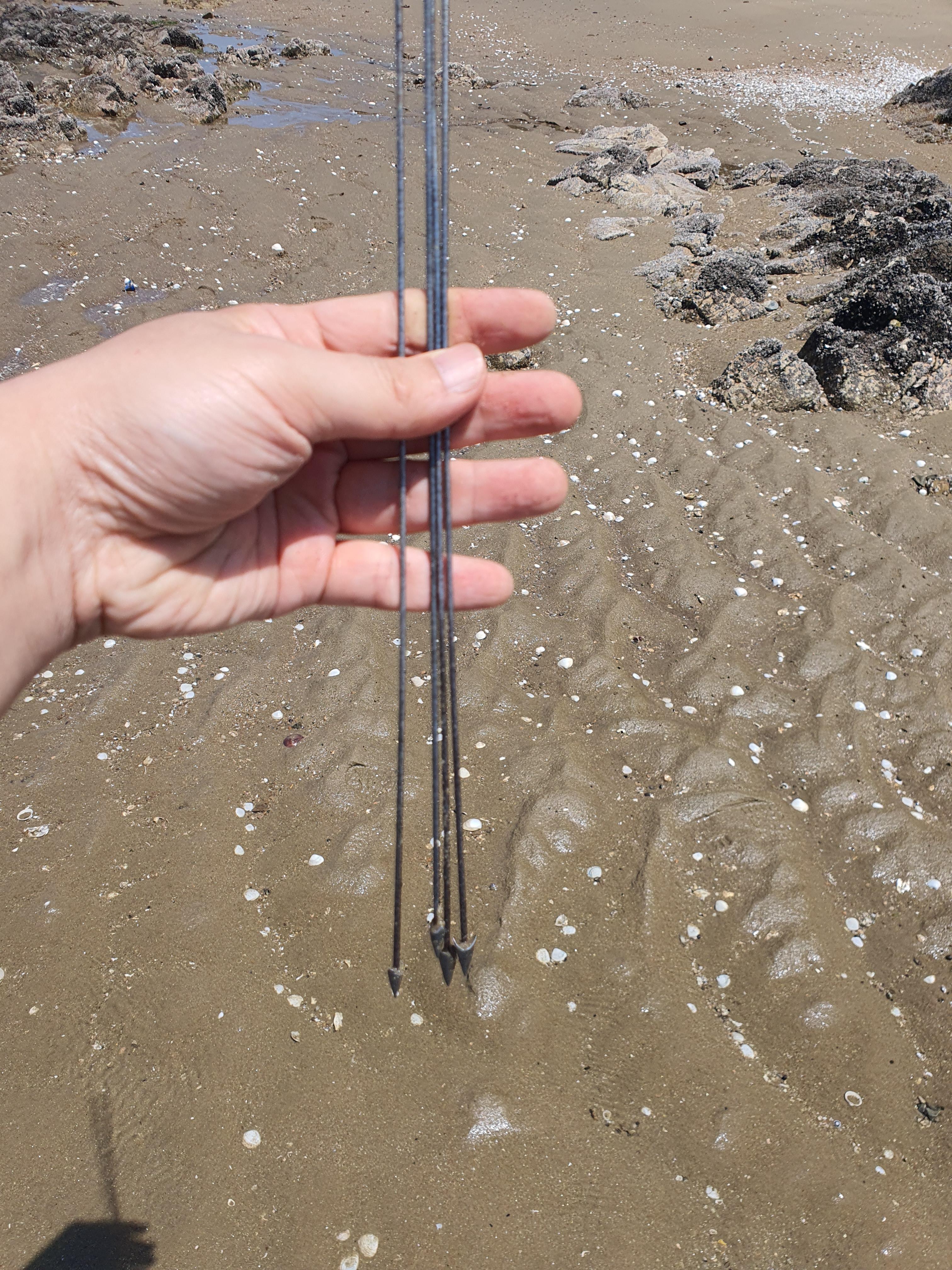 맛살 구멍에 작살을 꼽고 뽑으면 맛살이 걸려 나온다.