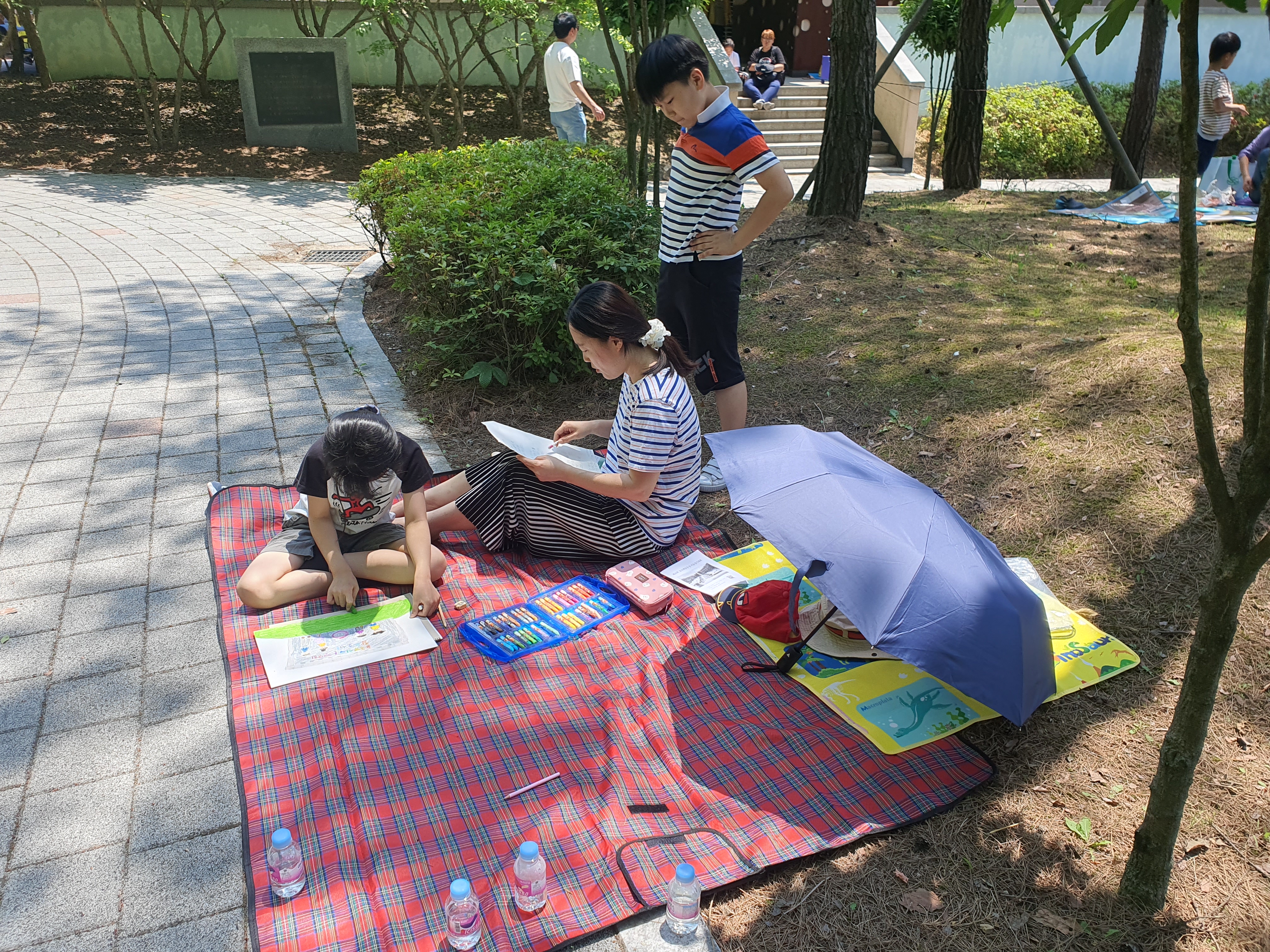 도착하고 보니 학생들이 진심이다. 텐트와 그늘막을 준비하고, 책상과 선풍기까지 준비를 했다. 우리는 처음이라 돗자리 정도만 준비했는데, 그림 그리는 친구들은 정말 준비가 정성이다. 우리처럼 참여가 목적이 아닌 수상이 목적인가 보다.