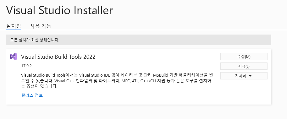 https://visualstudio.microsoft.com/ko/visual-cpp-build-tools/ 에서 다운로드 받을 수 있다.