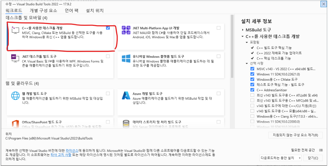 'C++를 사용한 데스크톱 개발'을 체크하고 설치한다.