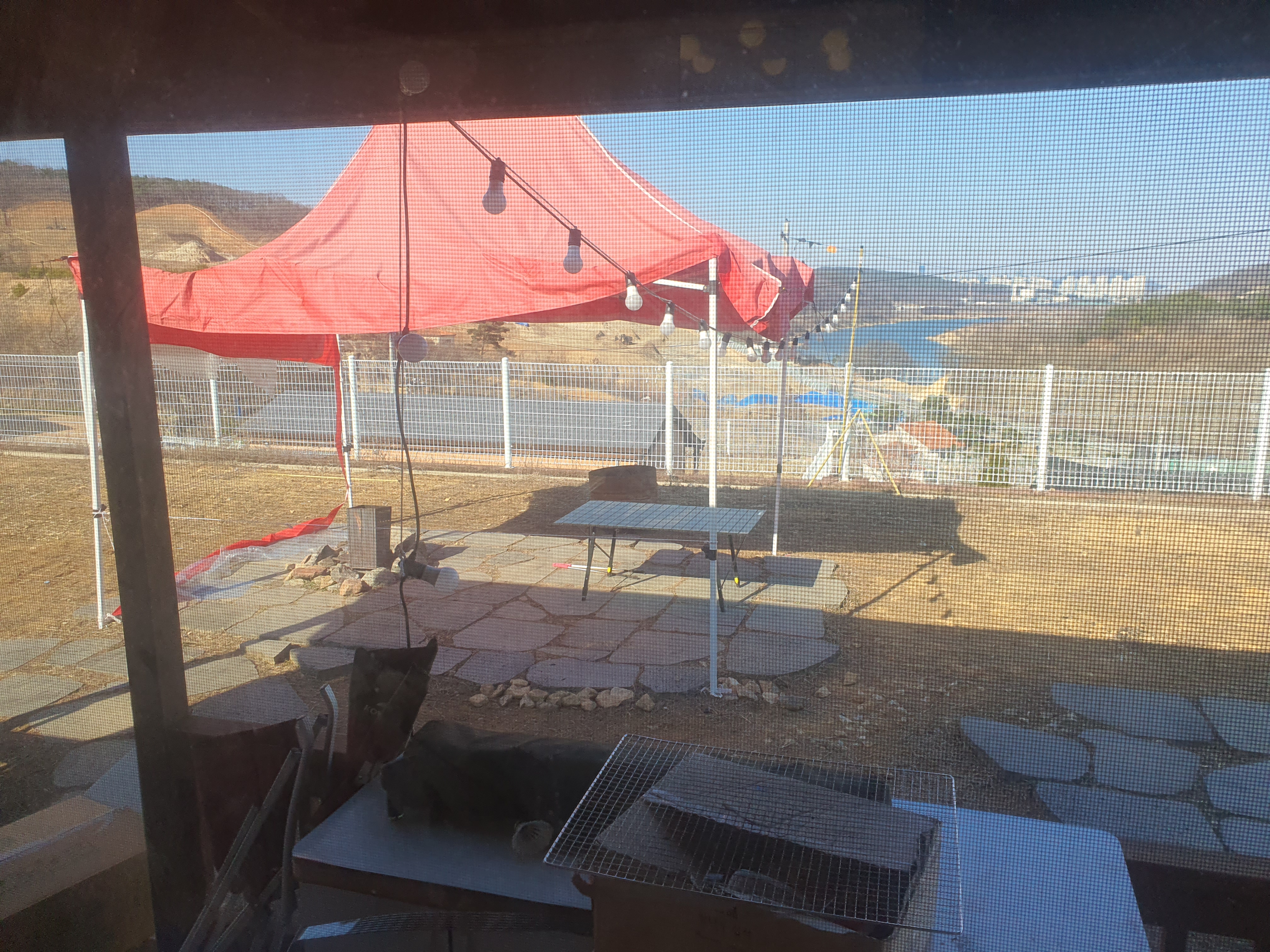 바람막이 텐트인데 겨울바람으로 많이 다쳤다.