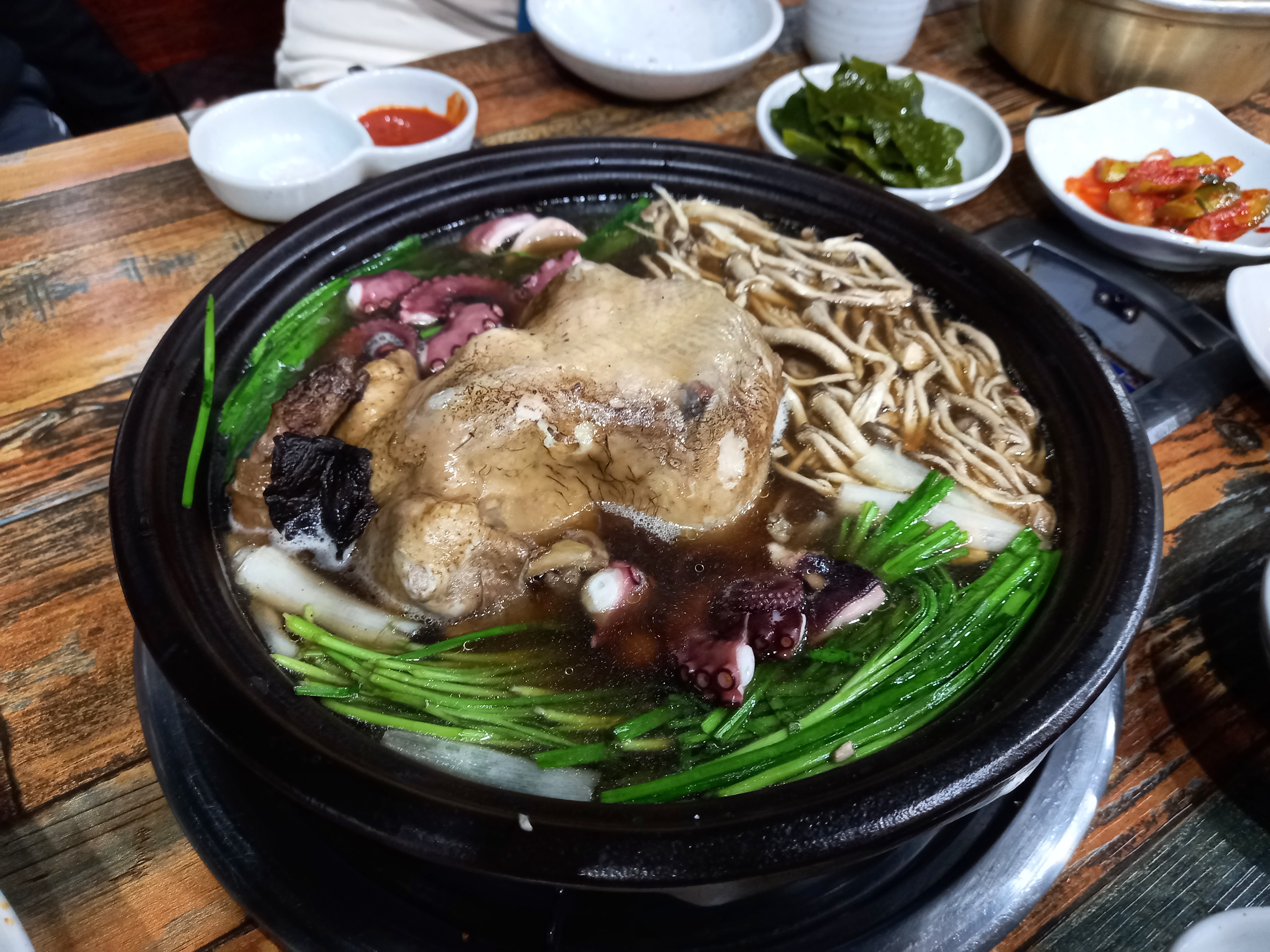 해신탕이던가? 시간이 오래걸린다는 주인장 말에 기다리겠다 했는데, 정말 오래 걸렸다. 1시간은 족히 기다린 것 같다. 해신탕의 경우 예약을 했야 한다고 했는데, 정말 이렇게 오래 걸릴 줄은 몰랐다. 기다리는 동안 몇 팀은 이미 밥을 먹고 나갔다.