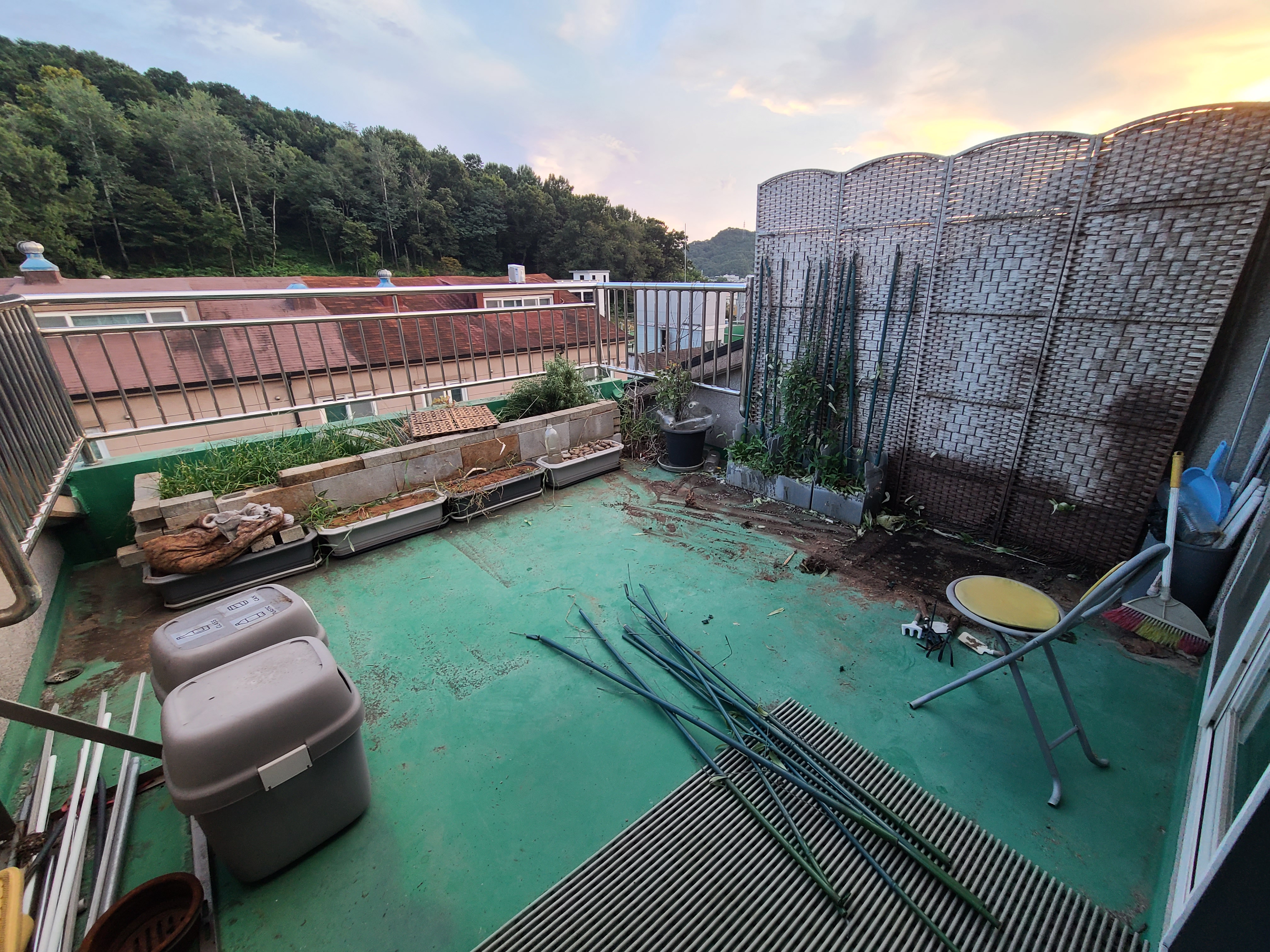 간만에 테라스 정리했다. 기존 모습을 카메라로 찍어둘걸 그랬다. 염원하던 에어컨 설치를 위해 테라스의 화단 하나를 해체해 버렸다. 원래는 문 앞 양 옆에 포도와 같은 덩굴식물을 심어 위쪽에 그늘을 만들려 했지만, 그러지 못하고 한쪽에만 화단을 만들어 그 의미를 잃어버렸었다. 그 후 블루베리등을 심었었지만, 햇볕이 너무 뜨거워서(정남향) 대부분의 식물들이 살지 못했다. 그나마 살고 있던 허브 하나가 에어컨 실외기에 자리를 내주면서 끝 화단으로 이사를 가게 되었다. 그곳은 문 앞보다 더 뜨거울 텐데... 올해를 넘길 수 있을지 미지수다.
