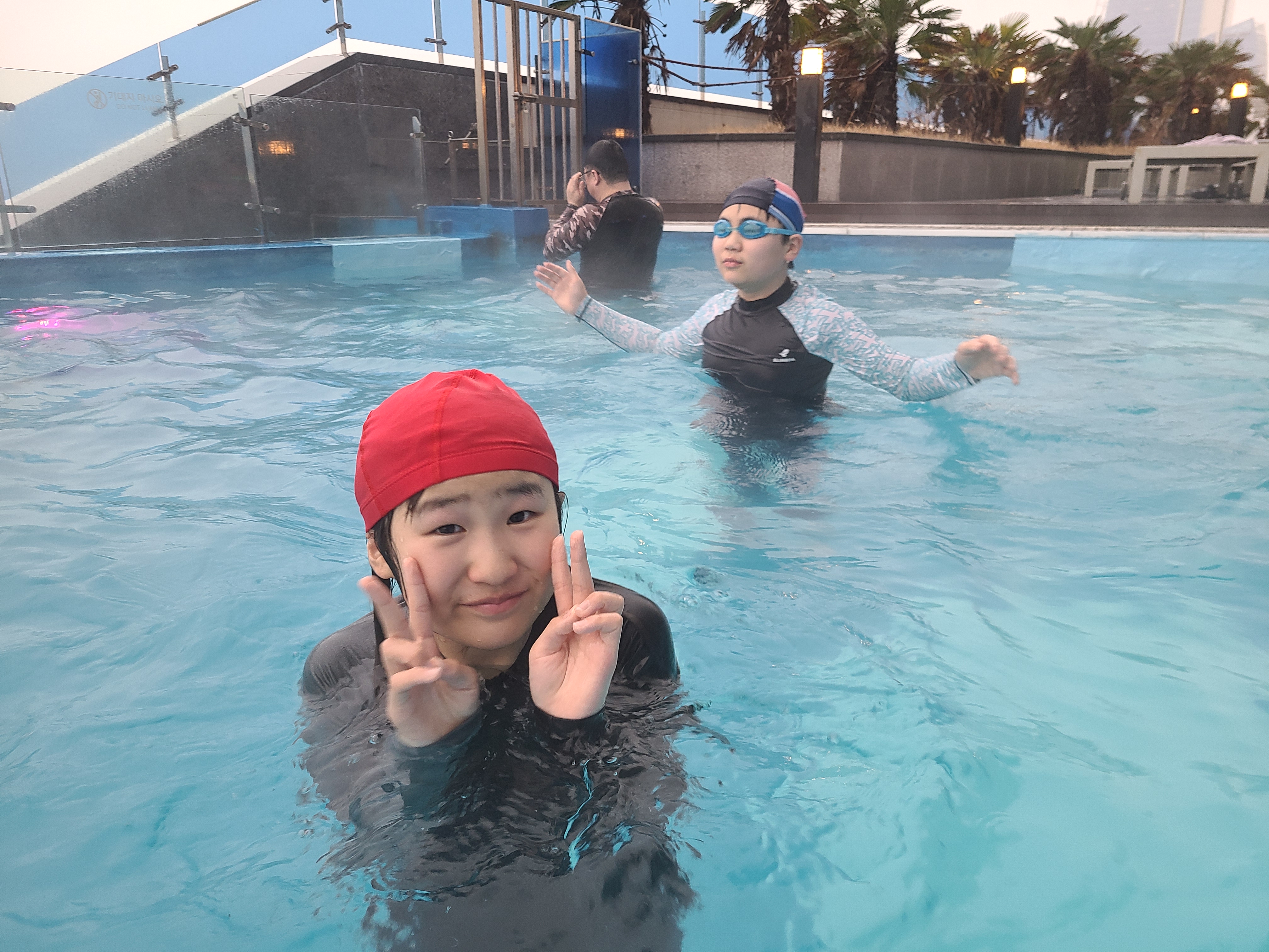 실외 수영장인데, 비가 오고 있음에도 물이 매우 따듯했다. 물밖은 정말 추웠고 한 번 들어가면 나오기 쉽지 않은 온도다.