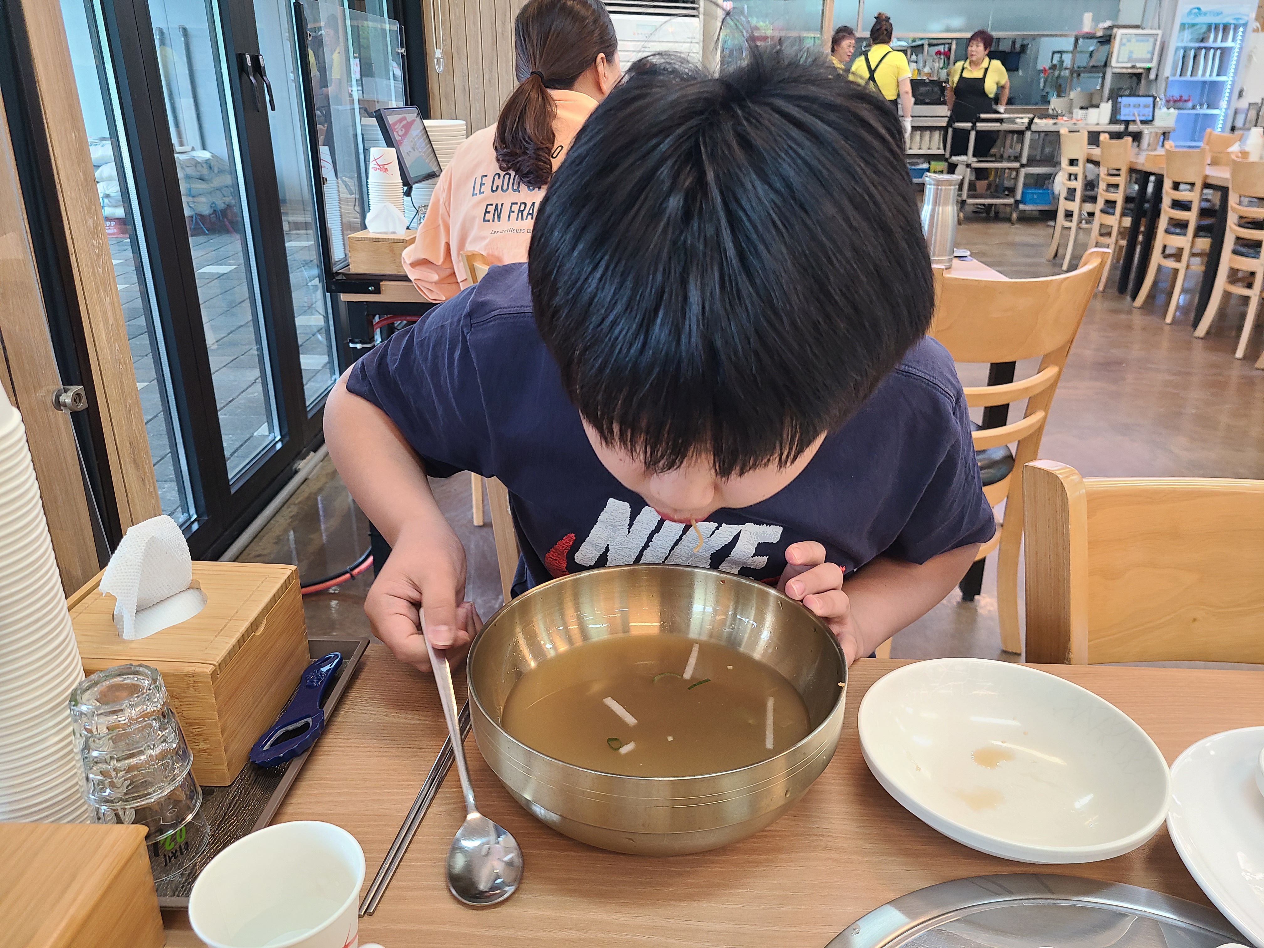 냉면 먹는 아들 모습이 너무도 귀여워서 아내에게 사진을 보냈더니 만두도 시켜 먹으라는 말에 다시 만두를 시켰다.