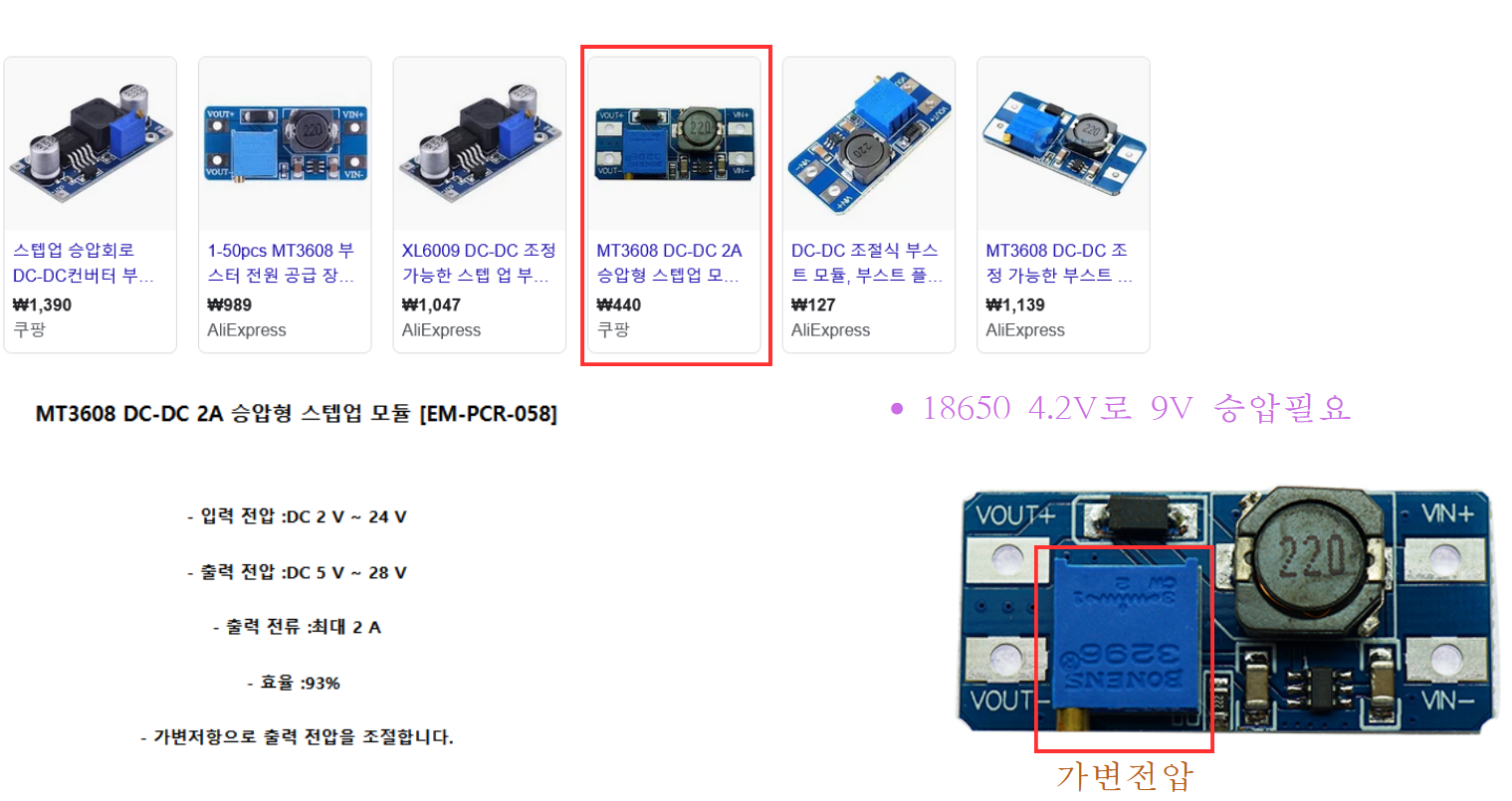 다시 테스터기로 돌아가 보자. 테스터기는 9V건전지를 이용한다. 18650 배터리는 4.2V을 제공하는데 9V를 만들기 위해서는 승압모듈이 필요하다.  쿠팡에서 구매했다.