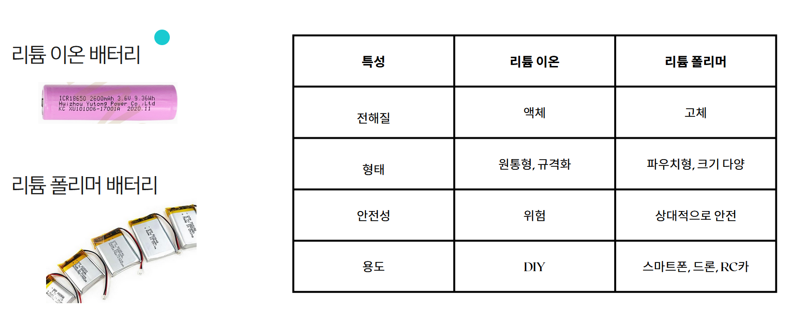 배터리를 조사해보니 리튬 이온 배터리와 리튬 폴리머 배터리가 주로 사용된다는 것을 알았다.