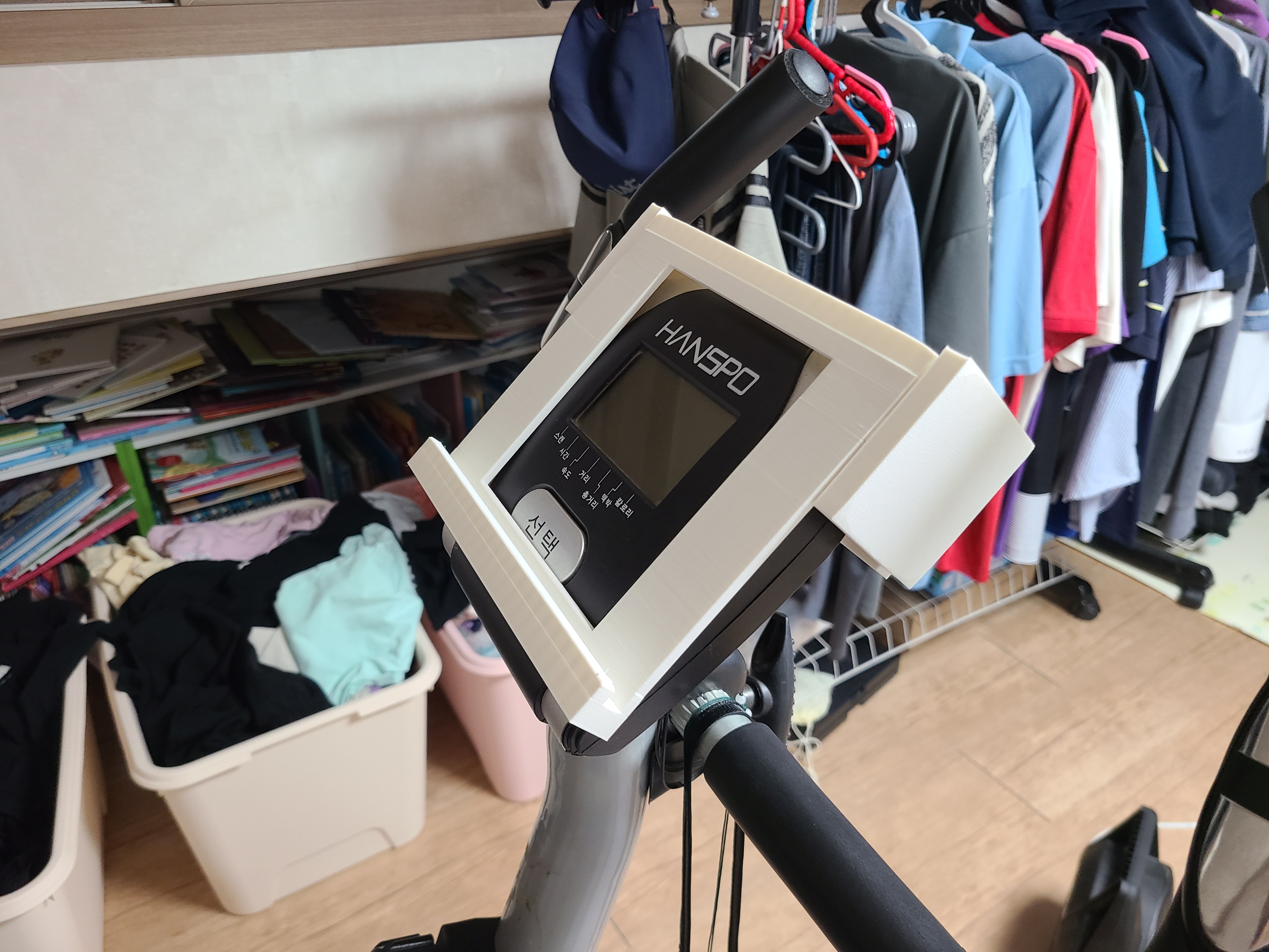 요즘엔 거의 타지 않지만, 운동용 자전거의 태블릿 거치대를 만들었다.