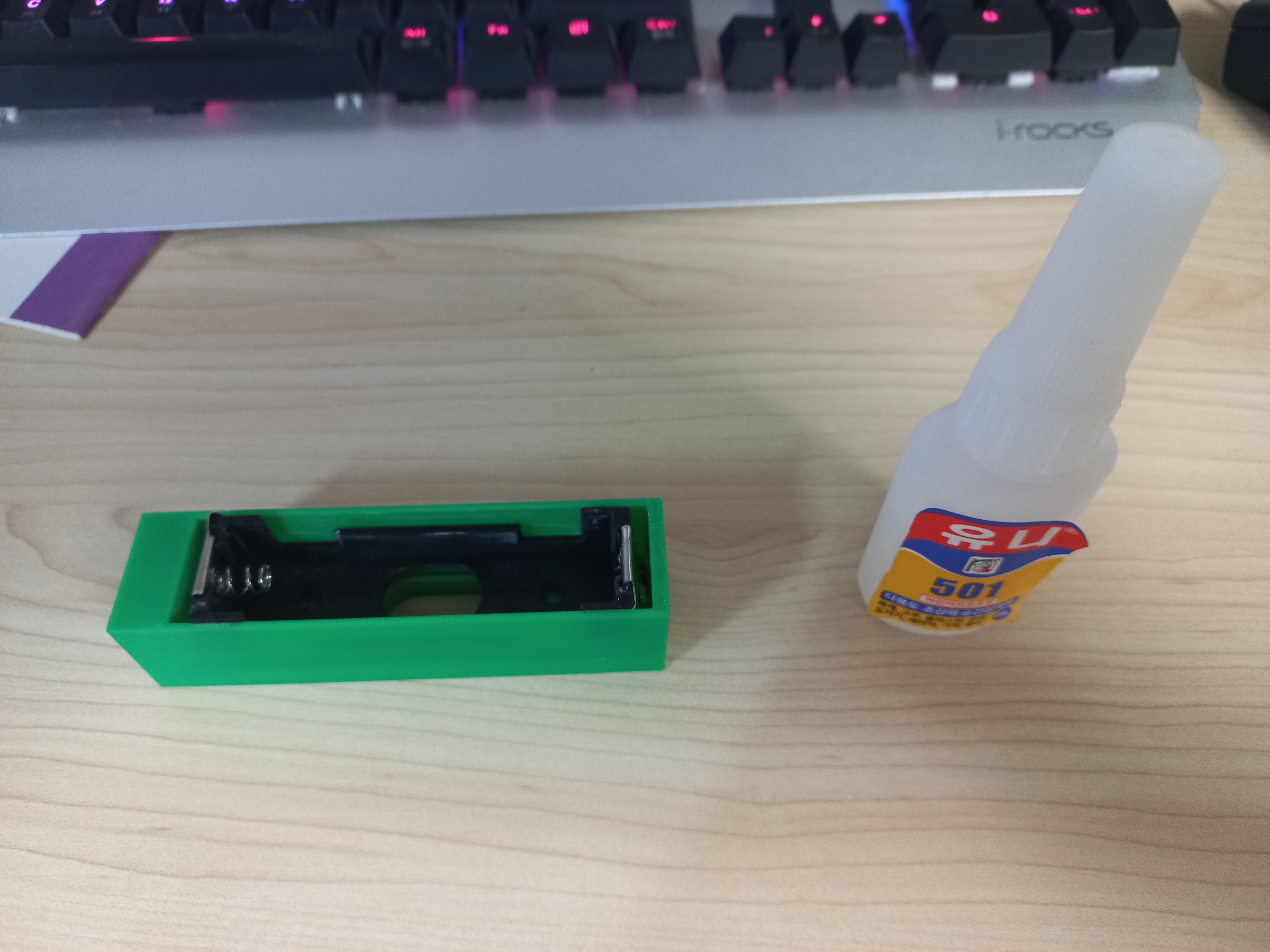 그리고 강력본드로 떨어지지 않도록 고정시켰다.(붙는데 시간이 오래 걸리고, 본드가 강력해서인지 필라멘트가 조금 녹는다.)