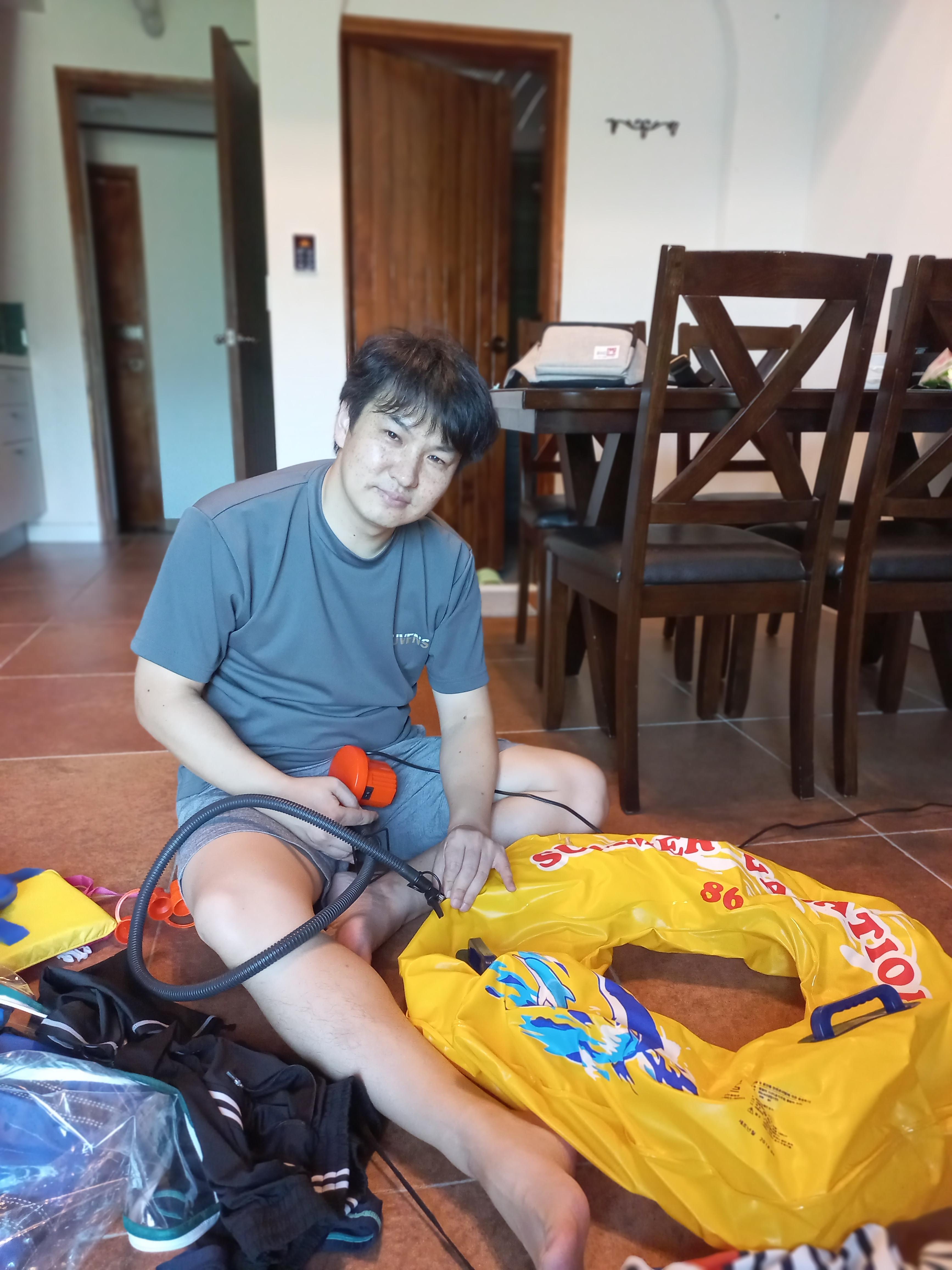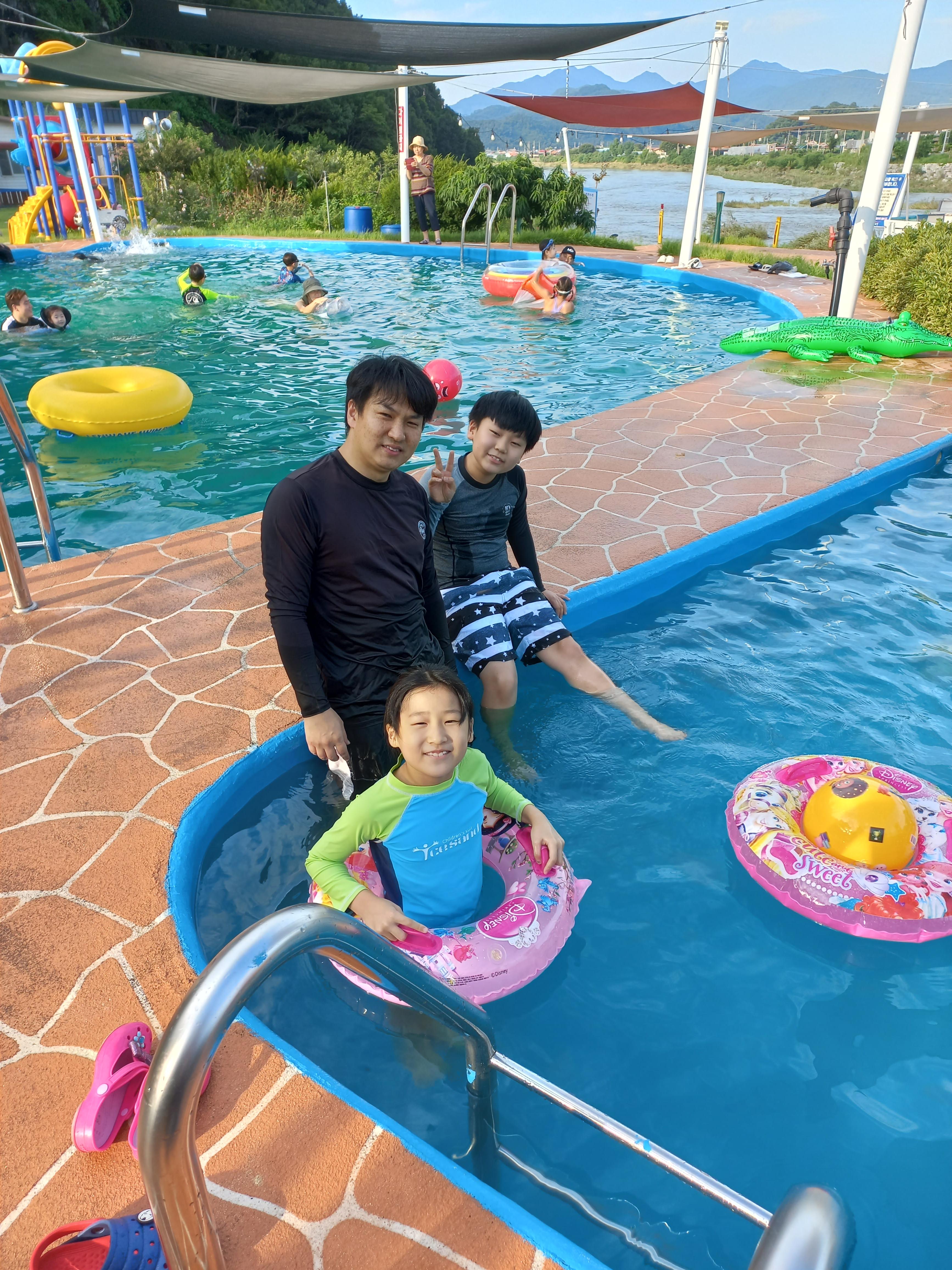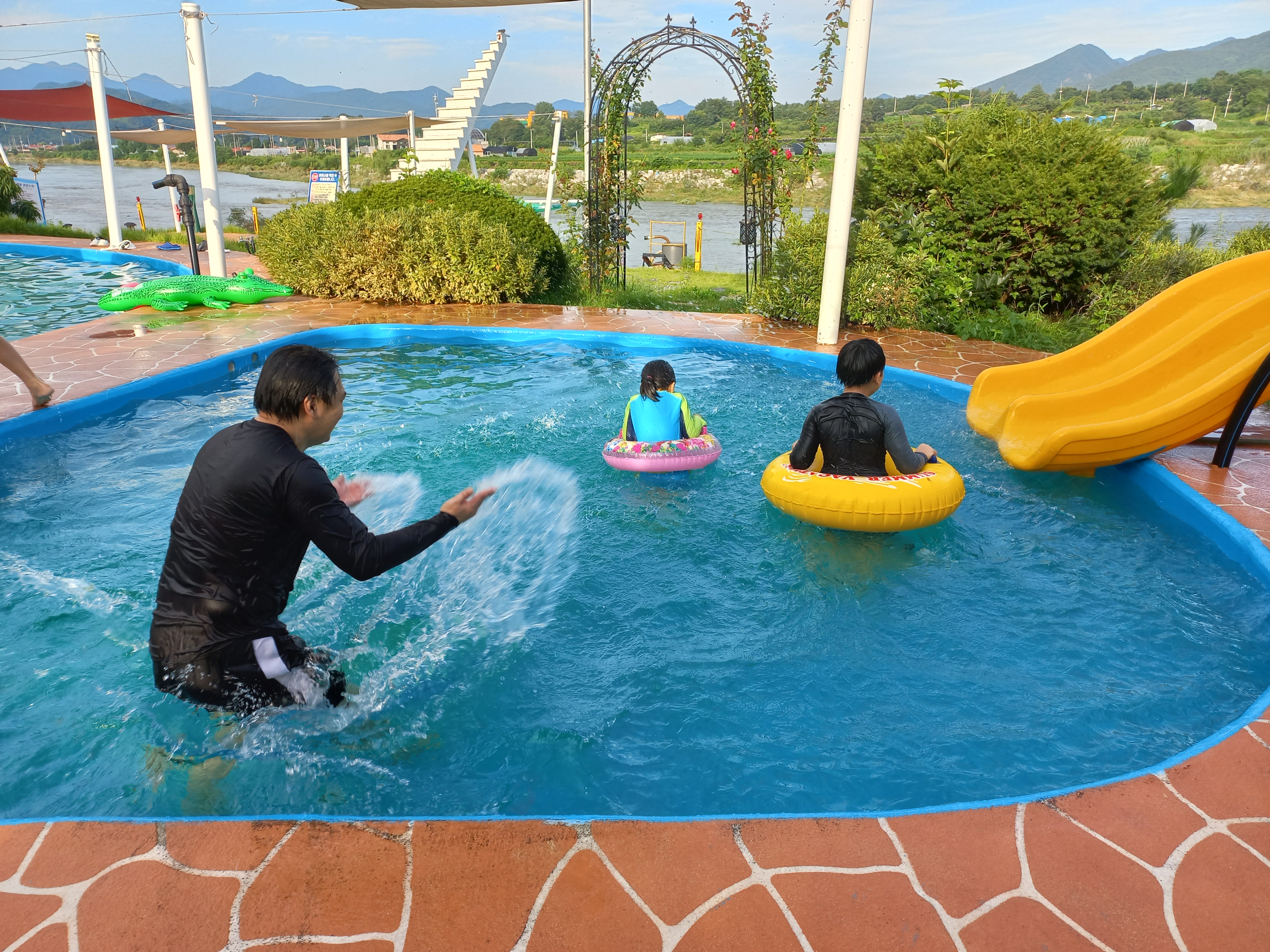 워크샵 때에는 산막이 길을 편도로 걸어가(약 40분) 선착장에서 다시 배로 편도로 돌아오는 코스였고 근처 펜션에서 묶어 이번에도 그렇게 갔다 오려고 했다. 하지만 여행 당일 택배로 시킨 물건이 오후 3시에 도착한다는 소식과 또 그 택배가 아이스크림이란 말에 출발이 늦을 수밖에 없었다. 택배는 정말 오후 3시 넘어서 왔고 괴산 펜션에 도착했을 때는 오후 5시가 다 되었었다. 펜션 안 수영장에 갈 예정이었기에 도착하자마자 물놀이 세팅을 마치고 바로 수영장에 들어갔다.