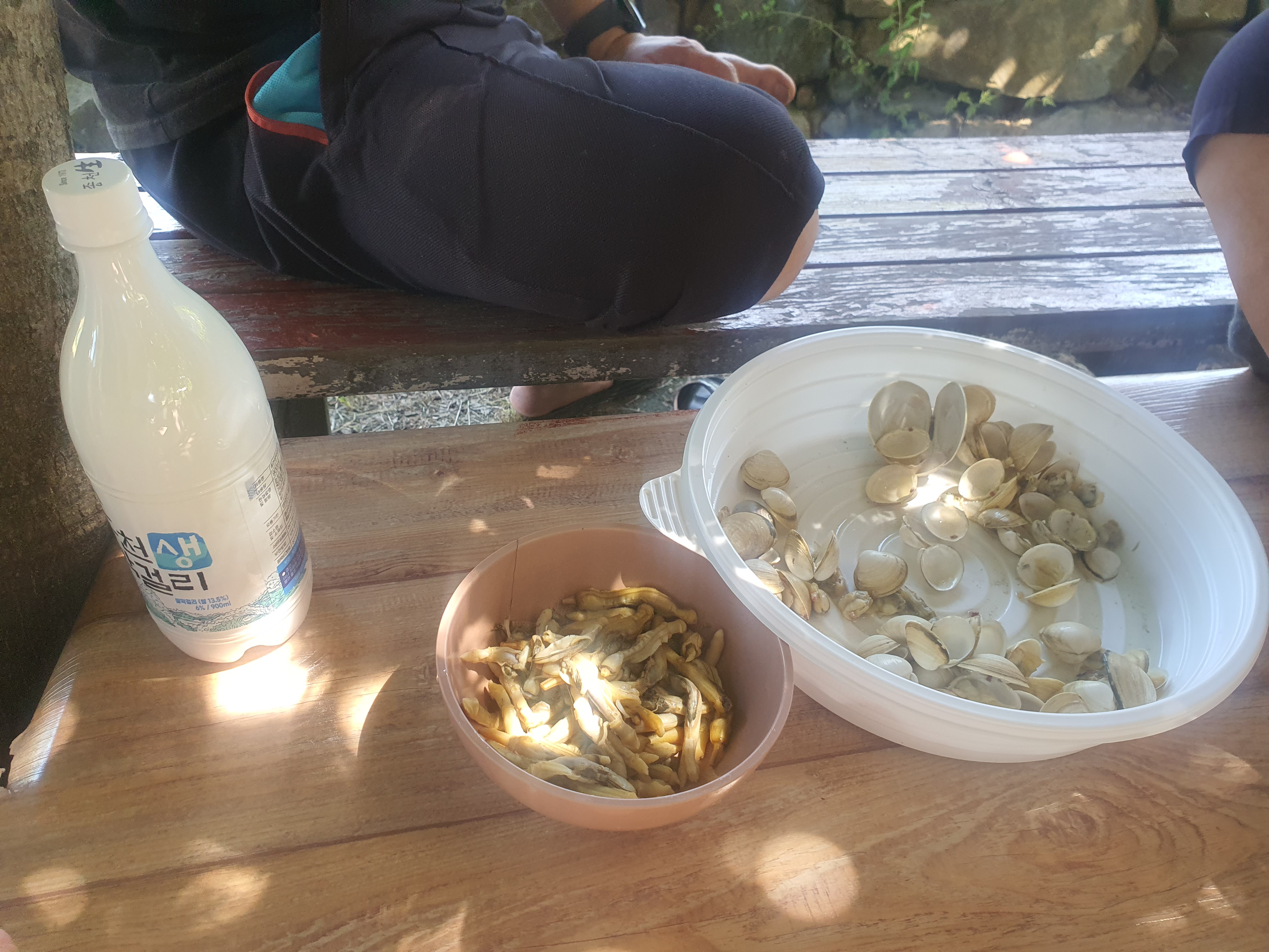도착 후 갯벌 가기 전에 간단한 과자와 막걸리를 먹는다.