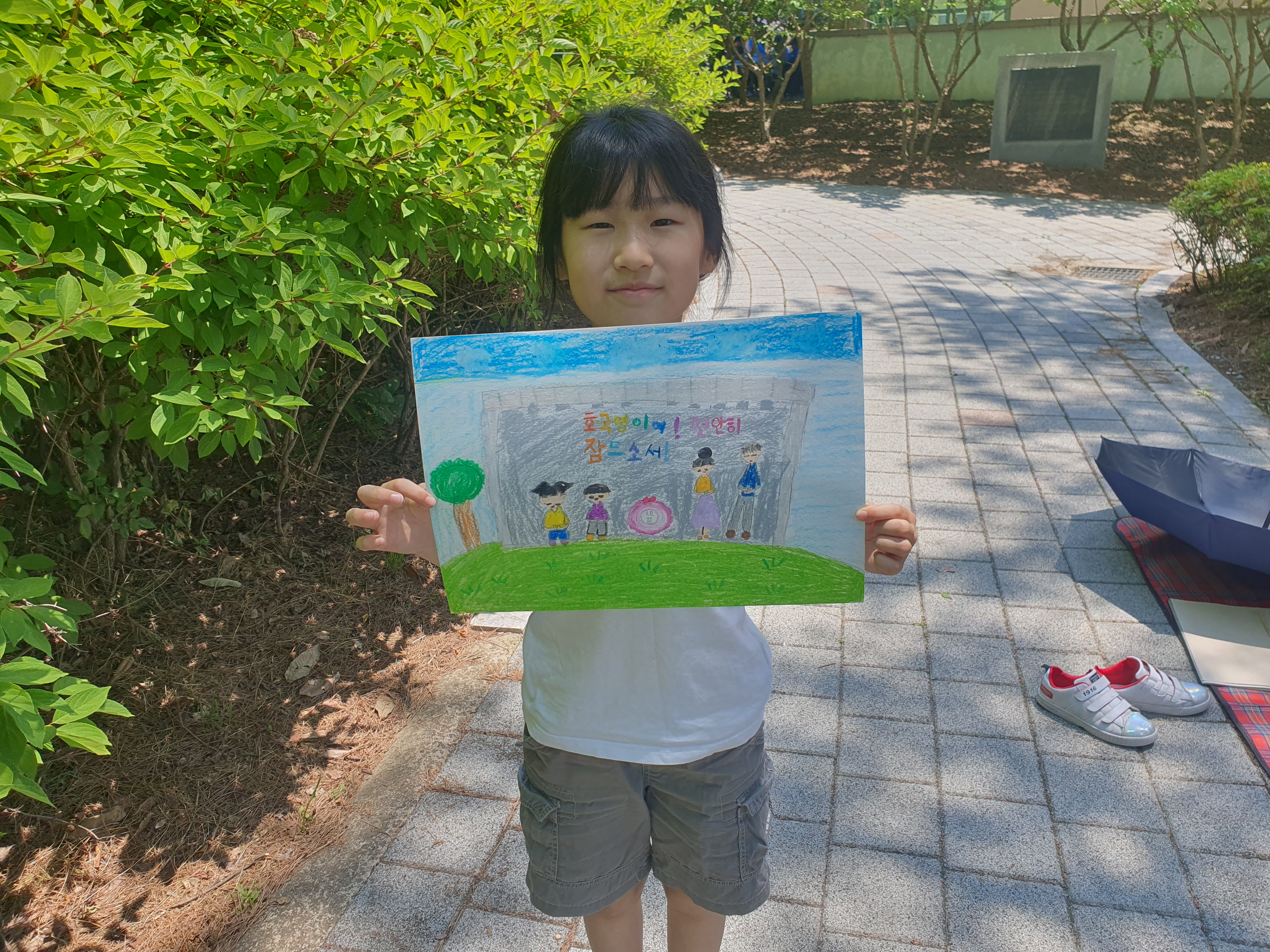10시에 호국영령들에 대한 묵념을 시작으로 초중고로 구분하여 행사가 시작되었다. 아들은 시, 딸은 그림을 선택했는데, 주제가 유월, 비석, 국화다. 그림은 건물들 중 하나를 직접 보고 그려야 하는데, 뙤약볕에 그늘 없이 그림을 그릴 수 없어서 사진으로 찍어 딸에게 보여 주었다. 실력은... 그래... 참가에 의미가 있는 것이지...