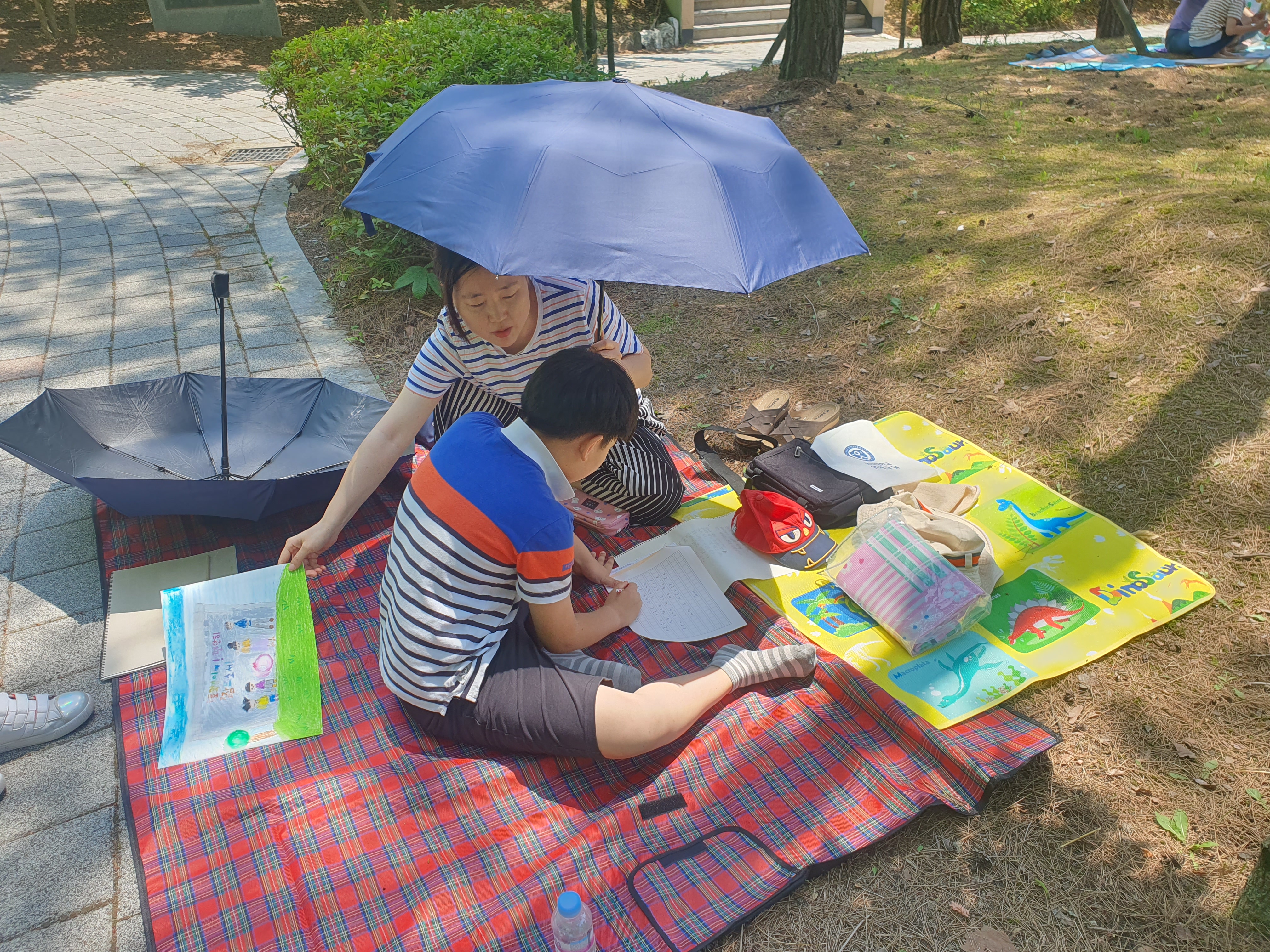 도착하고 보니 학생들이 진심이다. 텐트와 그늘막을 준비하고, 책상과 선풍기까지 준비를 했다. 우리는 처음이라 돗자리 정도만 준비했는데, 그림 그리는 친구들은 정말 준비가 정성이다. 우리처럼 참여가 목적이 아닌 수상이 목적인가 보다.