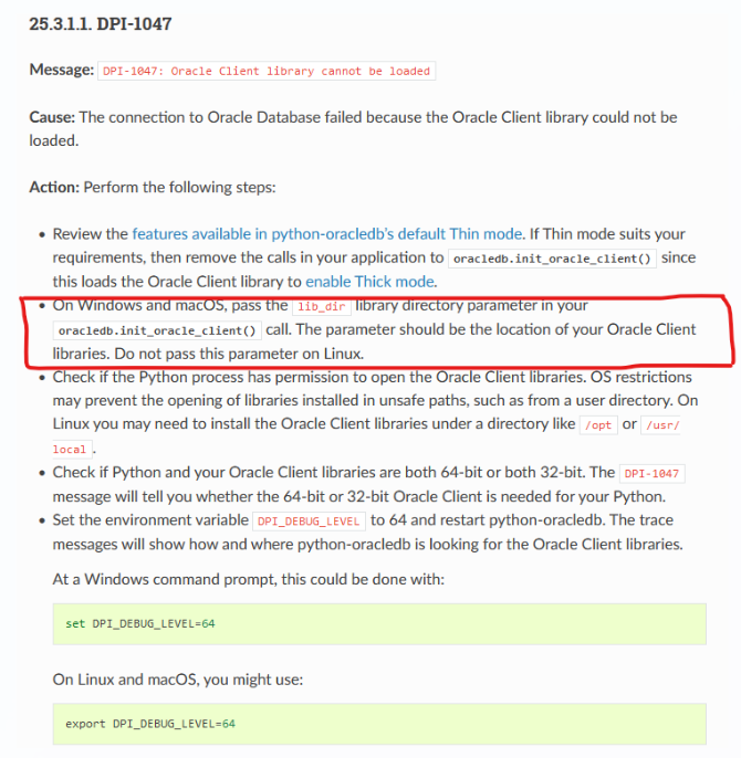 정확한 해석은 아니지만 윈도우나 맥의 경우 init_oracle_client()에 lib_dir 매개변수를 전달하고 리눅스에서는 넣지 말라는 뜻인 것 같다. 대신에 리눅스에서는 LD_LIBRARY_PATH를 추가하라고 페이지 밑에 나와 있었다.(캡처는 안 함)