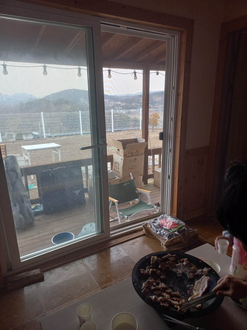 바람이 조금 불긴 했지만, 견디지 못 할 정도는 아니었다. 하지만 춥다는 마나님의 의견으로 건물 안에서 먹기로 했다.